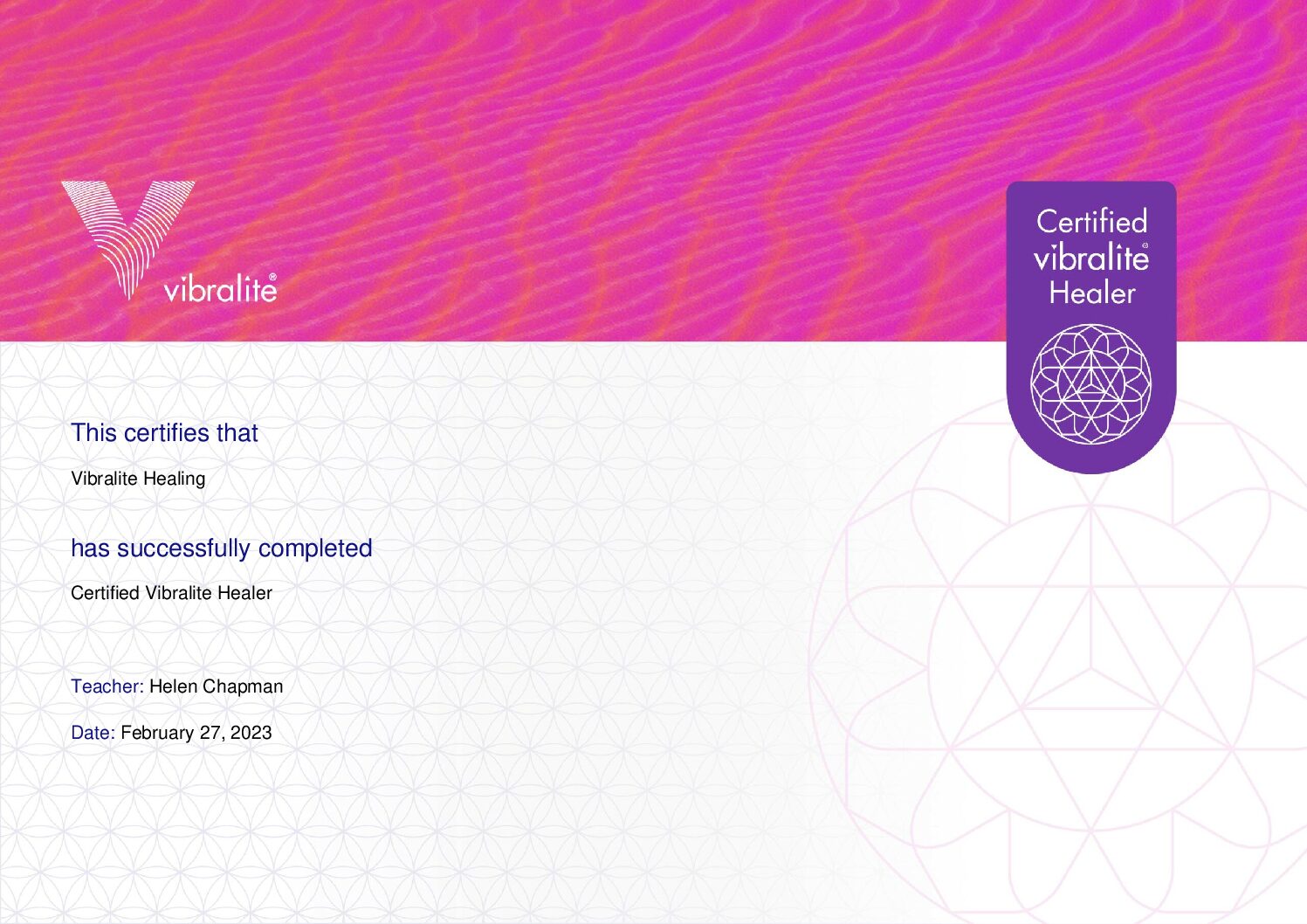 Become a Certified Vibralite Healer and receive this very special certificate.